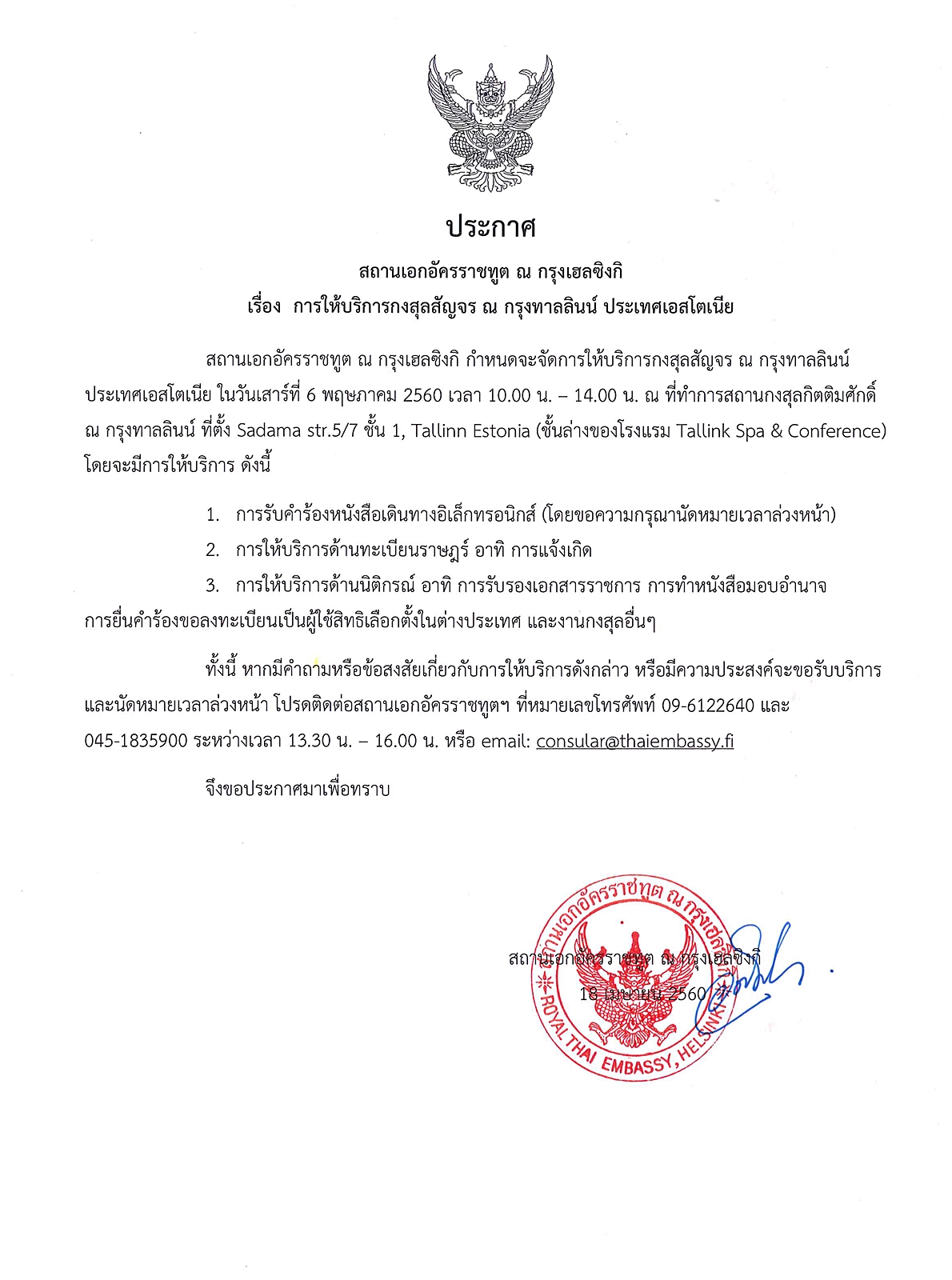 การให้บริการกงสุลสัญจร ณ กรุงทาลลินน์ ในวันเสาร์ที่ 6 พฤษภาคม 2560