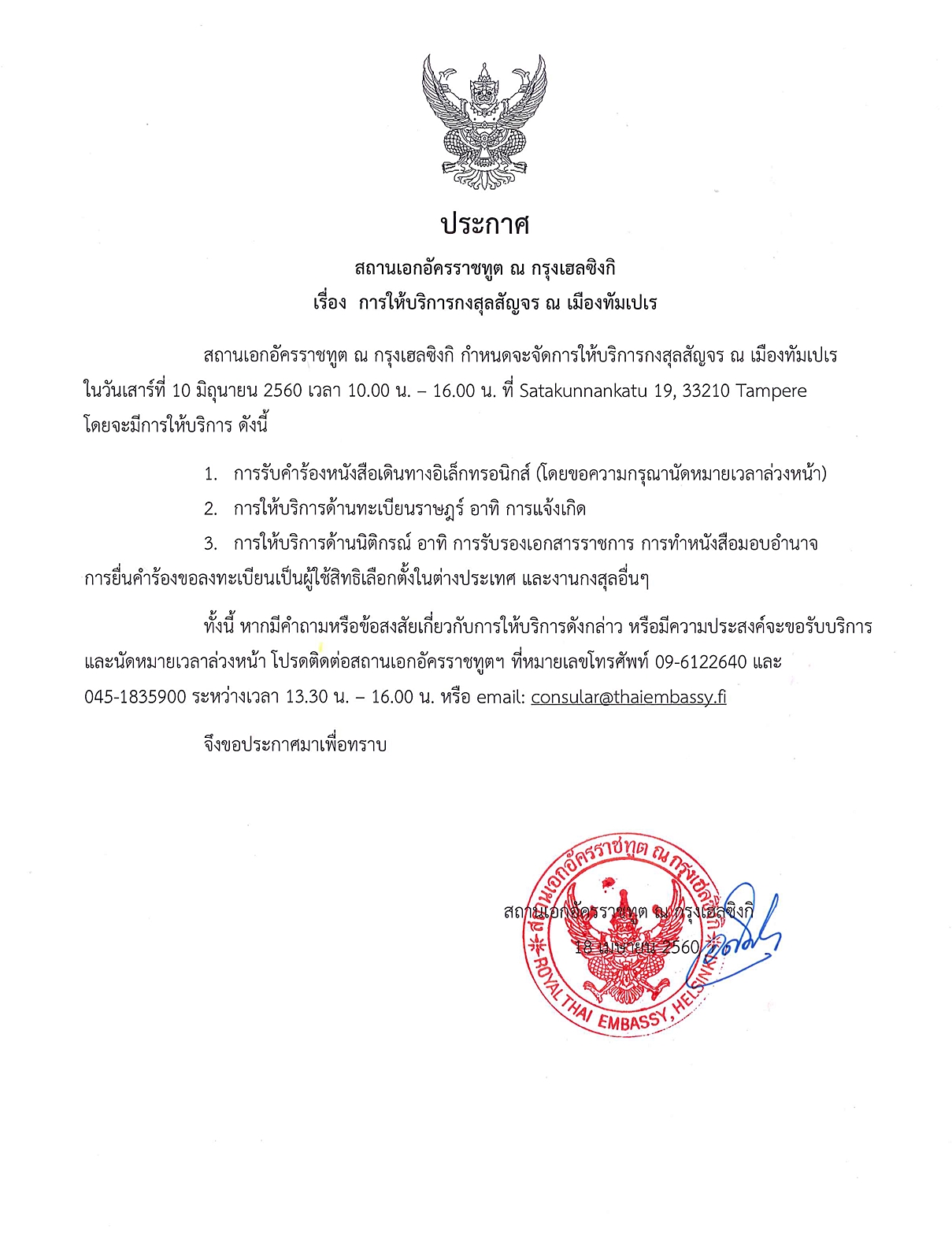 การให้บริการกงสุลสัญจร ณ เมืองทัมเปเร ในวันเสาร์ที่ 10 มิถุนายน 2560