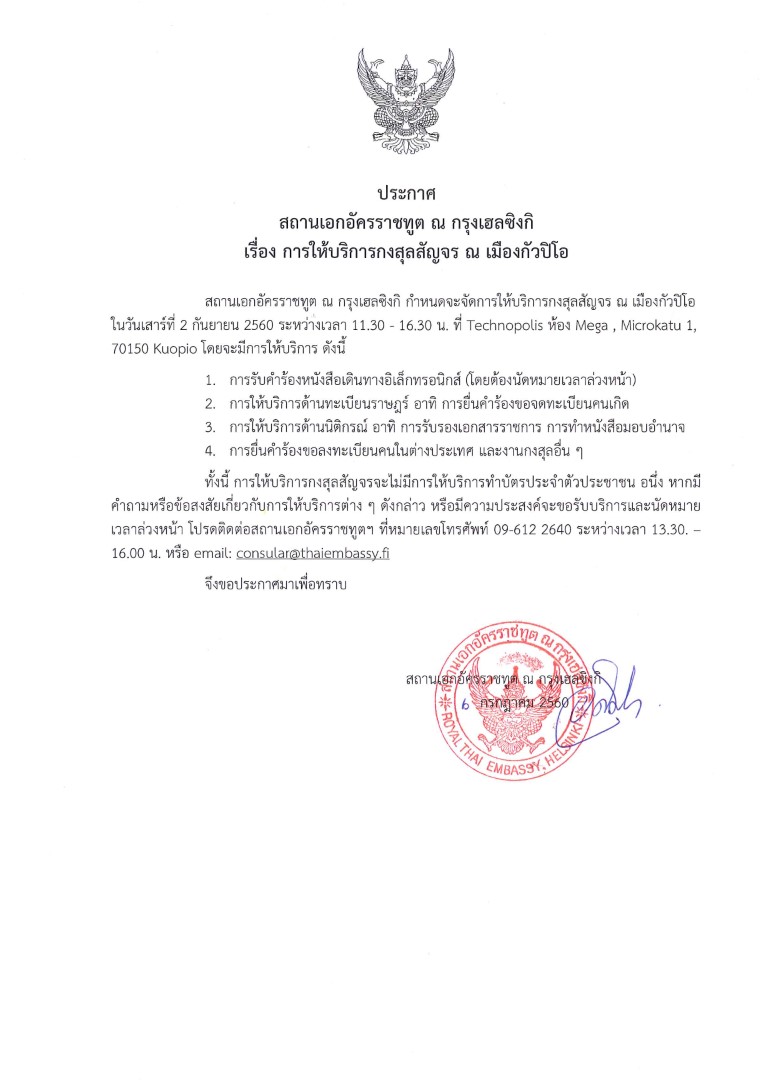 การให้บริการกงสุลสัญจร ณ เมืองกัวปิโอ ในวันเสาร์ที่ 2 กันยายน 2560