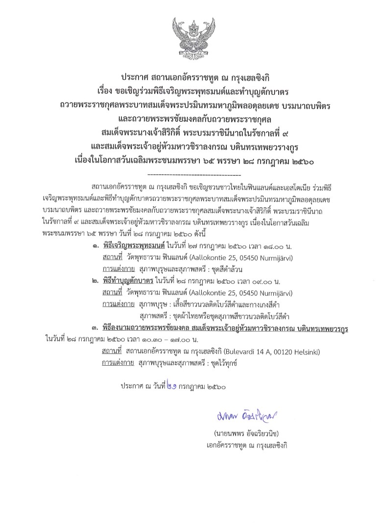 พิธีเจริญพระพุทธมนต์และพิธีทำบุญตักบาตรถวายพระราชกุศลพระบาทสมเด็จพระปรมินทรมหาภูมิพลอดุลยเดช บรมนาถบพิตร และถวายพระพรชัยมงคลกับถวายพระราชกุศลสมเด็จพระนางเจ้าสิริกิติ์ พระบรมราชินีนาถ ในรัชกาลที่ ๙ และสมเด็จพระเจ้าอยู่หัวมหาวชิราลงกรณ บดินทรเทพยวรางกูร เนื่องในโอกาสวันเฉลิมพระชนมพรรษา ๖๕ พรรษา ๒๘ กรกฎาคม ๒๕๖๐