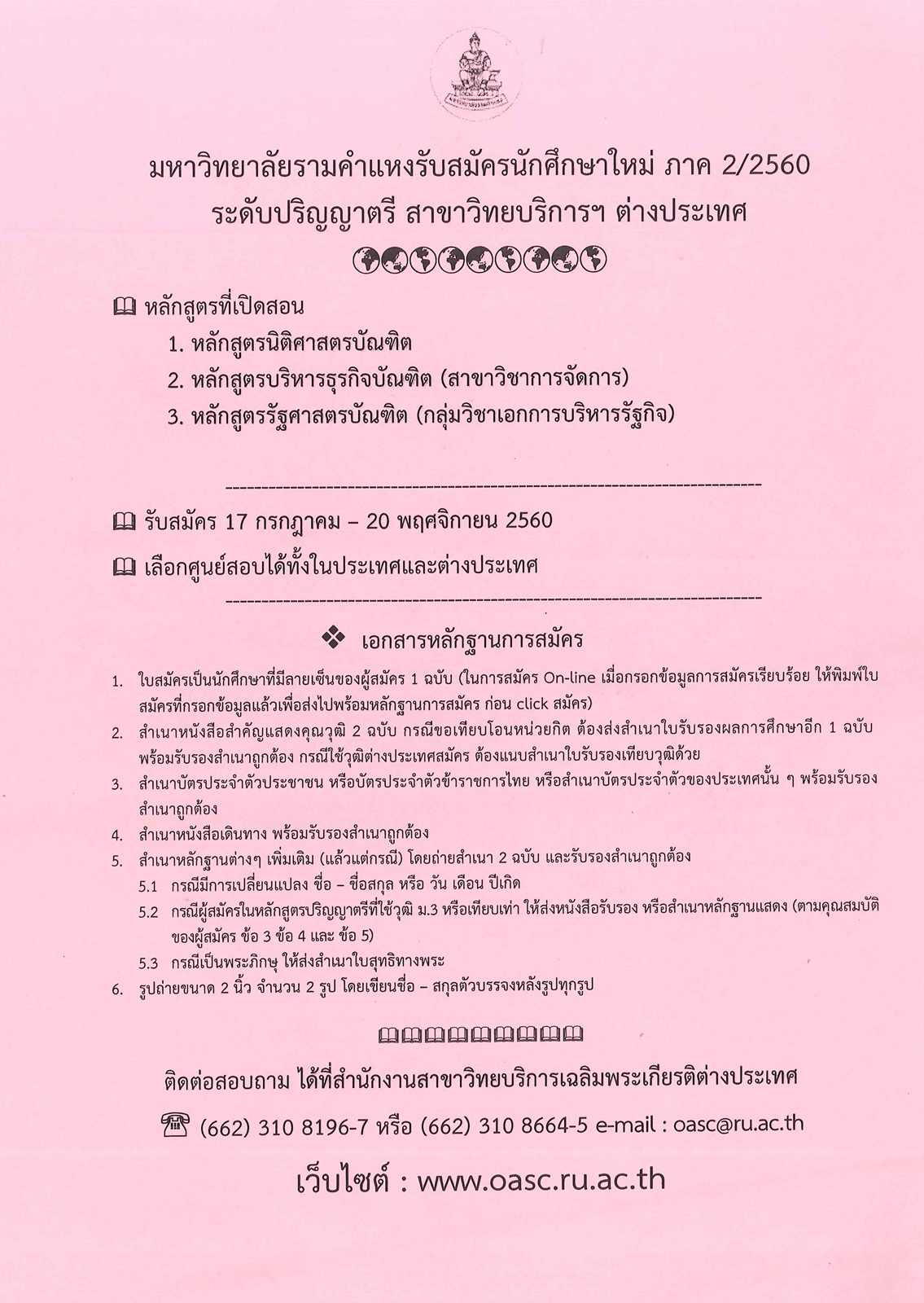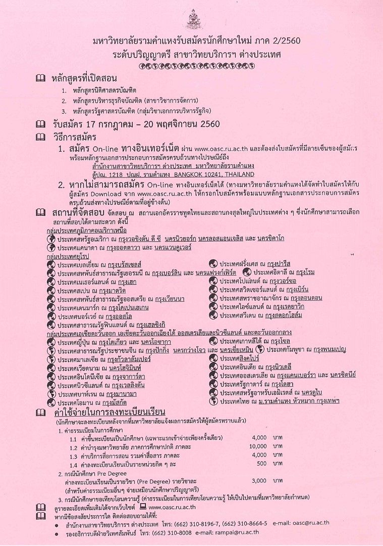 มหาวิทยาลัยรามคำแหงรับสมัครนักศึกษาใหม่ ภาค 2/2560 ระดับปริญญาตรี สาขาวิทยบริการฯ ต่างประเทศ