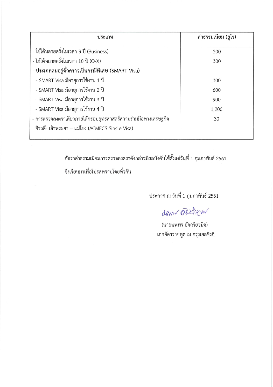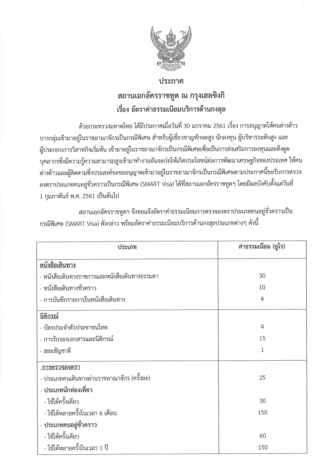 อัตราค่าธรรมเนียมบริการด้านกงสุล ประกาศวันที่ 1 กุมภาพันธ์ 2561
