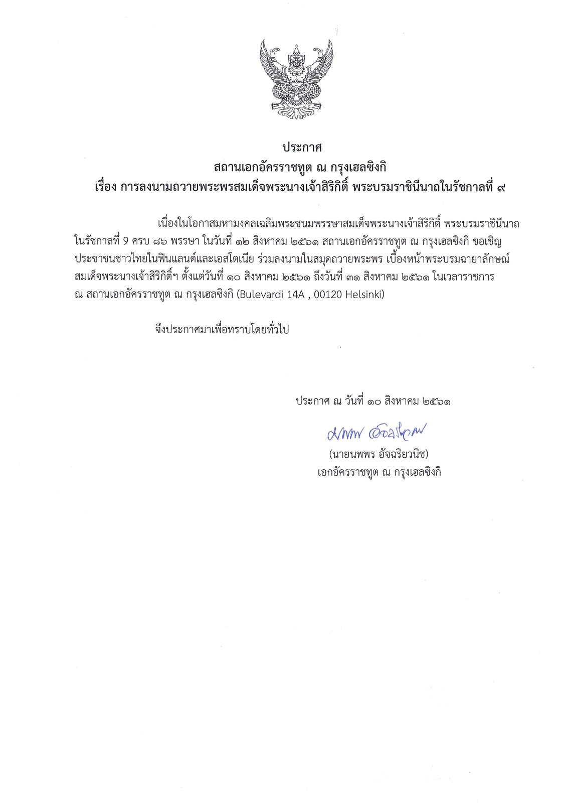 เนื่องในโอกาสวันเฉลิมพระชนมพรรษา สมเด็จพระนางเจ้าสิริกิติ์ พระบรมราชินีนาถ ในรัชกาลที่ ๙ ครบ ๘๖ พรรษา วันที่ ๑๒ สิงหาคม ๒๕๖๑ สถานเอกอัครราชทูต ณ กรุงเฮลซิงกิ ขอเชิญประชาชนชาวไทยในฟินแลนด์และเอสโตเนีย ร่วมลงนามในสมุดถวายพระพร เบื้องหน้าพระบรมฉายาลักษณ์สมเด็จพระเจ้าอยู่หัว ตั้งแต่วันที่ ๑๐ สิงหาคม ๒๕๖๑ ถึงวันที่ ๓๑ สิงหาคม ๒๕๖๑ ในเวลาราชการ ณ สถานเอกอัครราชทูต ณ กรุงเฮลซิงกิ (Bulevardi 14A , 00120 Helsinki)